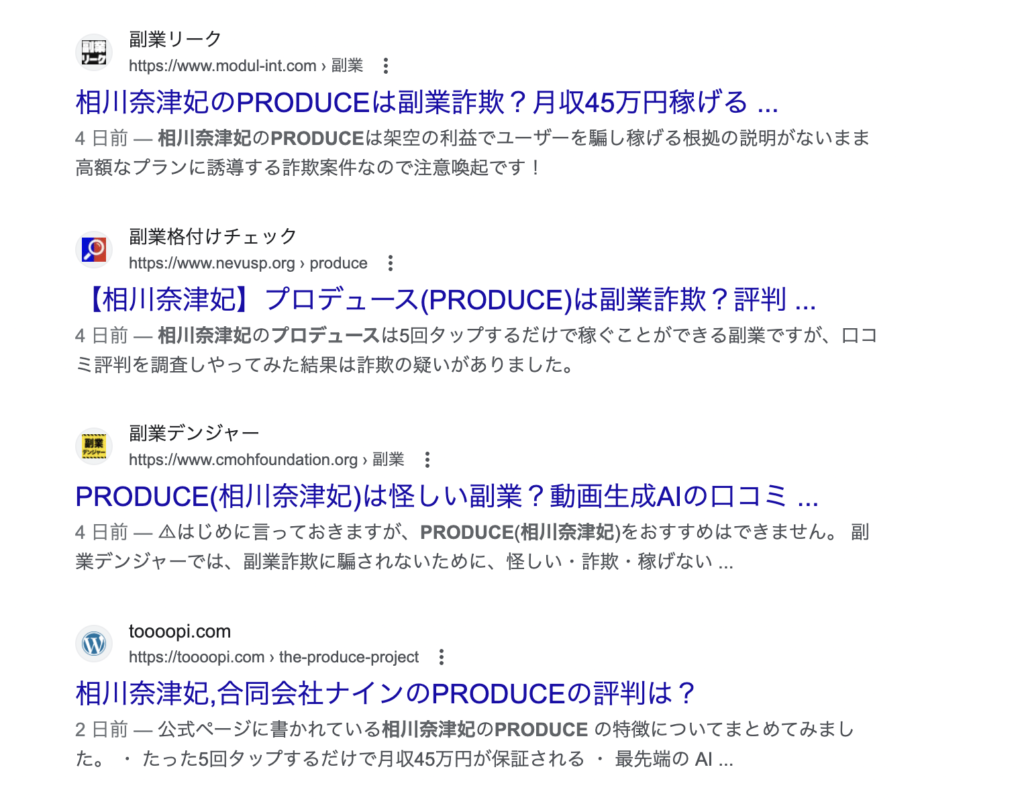 ちなみに、相川奈津妃さんのPRODUCEの評判や口コミですがネット検索をかけてみるとこんな検索結果がでてきますw